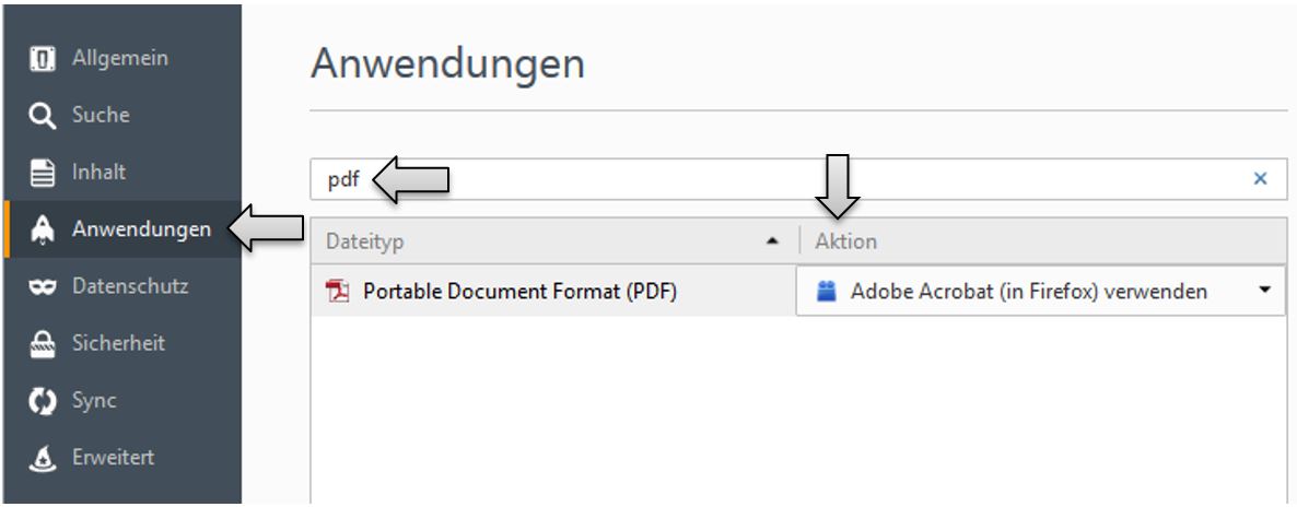 3. Stellen Sie sicher, dass unter Aktion „Adobe Acrobat (in Firefox) verwendent“ hinterlegt ist. Sollte dieser Eintrag nicht verfügbar sein, wählen Sie den Eintrag "Mit Adobe Acrobat Reader ... öffnen (Stand..." aus.