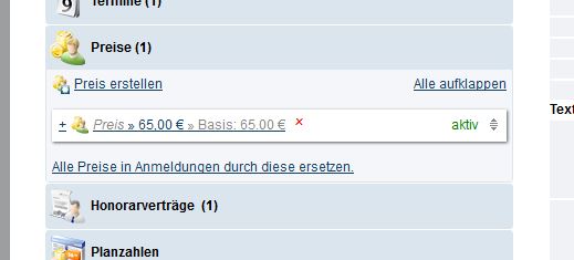 „Festgesetzt“ erscheint hinter dem Preis, wenn dieser abgerechnet ist (Bsp. Alle Anmeldungen einer Veranstaltung sind abgerechnet oder die Eigenschaft "abrechnen" der Anmeldungen steht auf "ja").