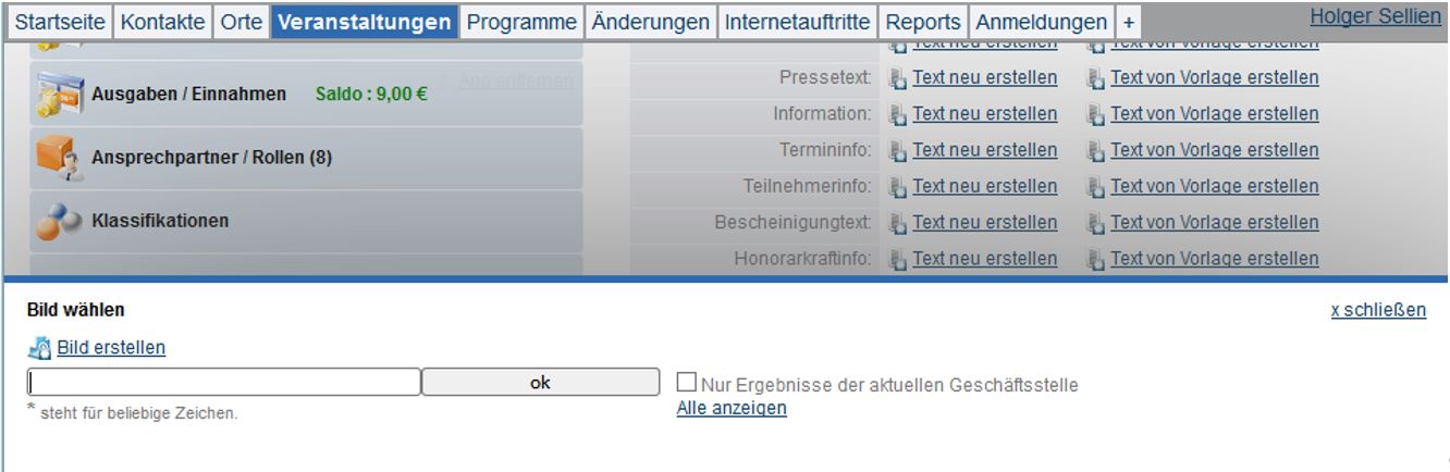 Soll das Bild neben dem Veranstaltungstext erscheinen, klicken Sie die „…“ der Eigenschaft „Bild“ des Eigenschaftsblocks „Internetauftritt“ der Veranstaltung an. Danach klicken Sie den Link „Bild erstellen“ an, sollte das einzufügende Bild noch nicht gespeichert worden sein.