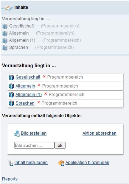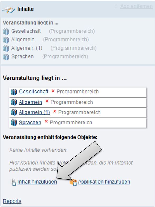 Alternativ können Sie auch über die Applikation „Inhalte“ ein Bild unter dem Veranstaltungstext einfügen. Hierzu bitte die Applikation öffnen/anklicken und dann den Link „Inhalt hinzufügen“ anklicken.