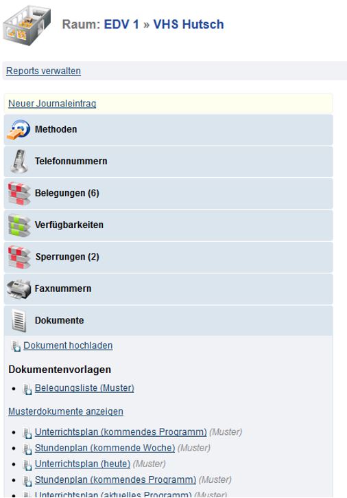 In der Applikation „Dokumente“ sind bei den Orten verschiedene, dieses Objekt betreffende Dokumente zu finden. Hierbei handelt es sich um Belegungslisten für verschiedenen Zwecke (Aushang, Hausmeisterinformation, ...).