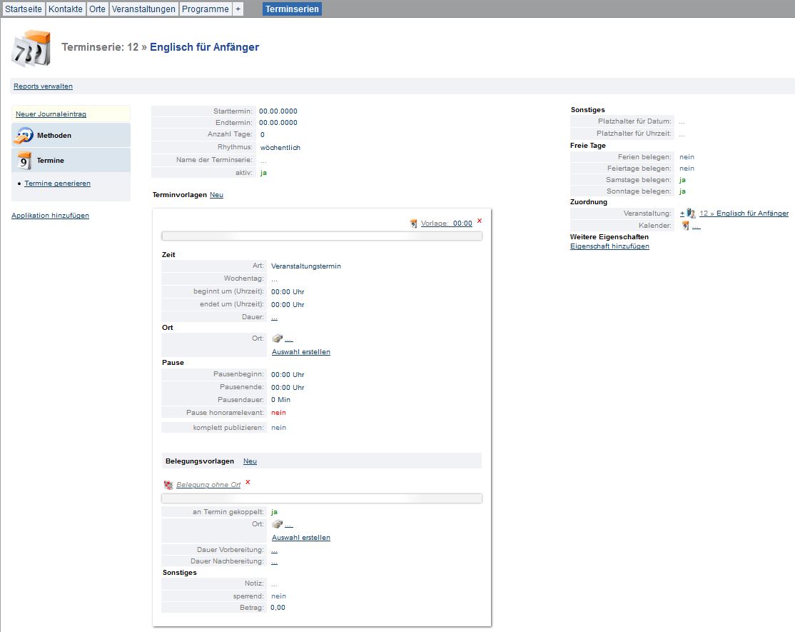 Sie werden automatisch auf die Detailansicht der neu erstellten Terminserie weitergeleitet. In der rechten Spalte legen Sie nun zuerst die Vorgabewerte für die zu erstellenden Termine und Belegungen an.