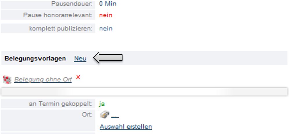 Findet eine Veranstaltung an zwei Orten statt (Bsp. Theatergruppe: ein Raum zum Umkleiden und ein Raum zum Proben), dann muss eine weitere Belegungsvorlage der Terminserie hinzugefügt werden. Dies geht über den Link „Neu“ neben dem Wort „Belegungsvorlage“ in der Terminvorlage.