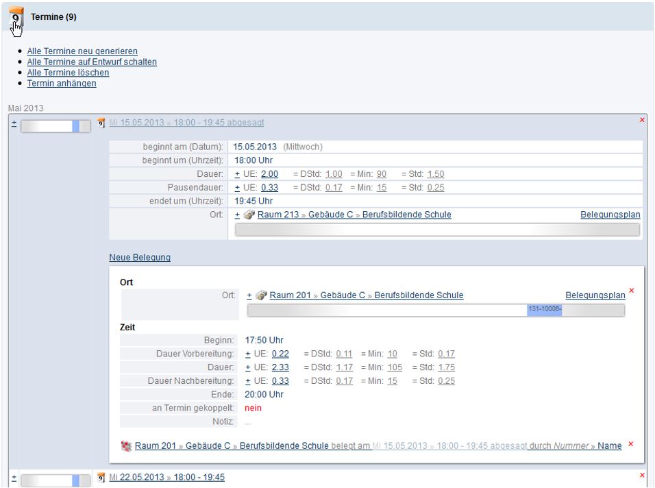 In dieser Schnellansicht kann man sowohl die Daten des Termins als auch die der zugehörigen Belegung überarbeiten.