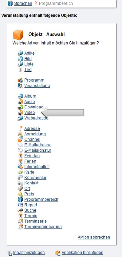 Ein Video können Sie über die Applikation „Inhalte“ in der jeweiligen Veranstaltung hinzufügen. Sie wählen dort „Inhalt hinzufügen“ und danach „Video“ und „Video erstellen“ aus, sollte das einzufügende Video noch nicht gespeichert worden sein oder Sie die URL/Webadresse des Videos haben.
