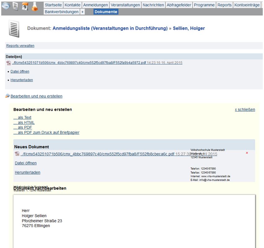 Nachdem die Detailseite des Dokuments angezeigt wird, kann es nach anklicken des Links „Bearbeiten und neu erstellen“ individuell verändert werden.