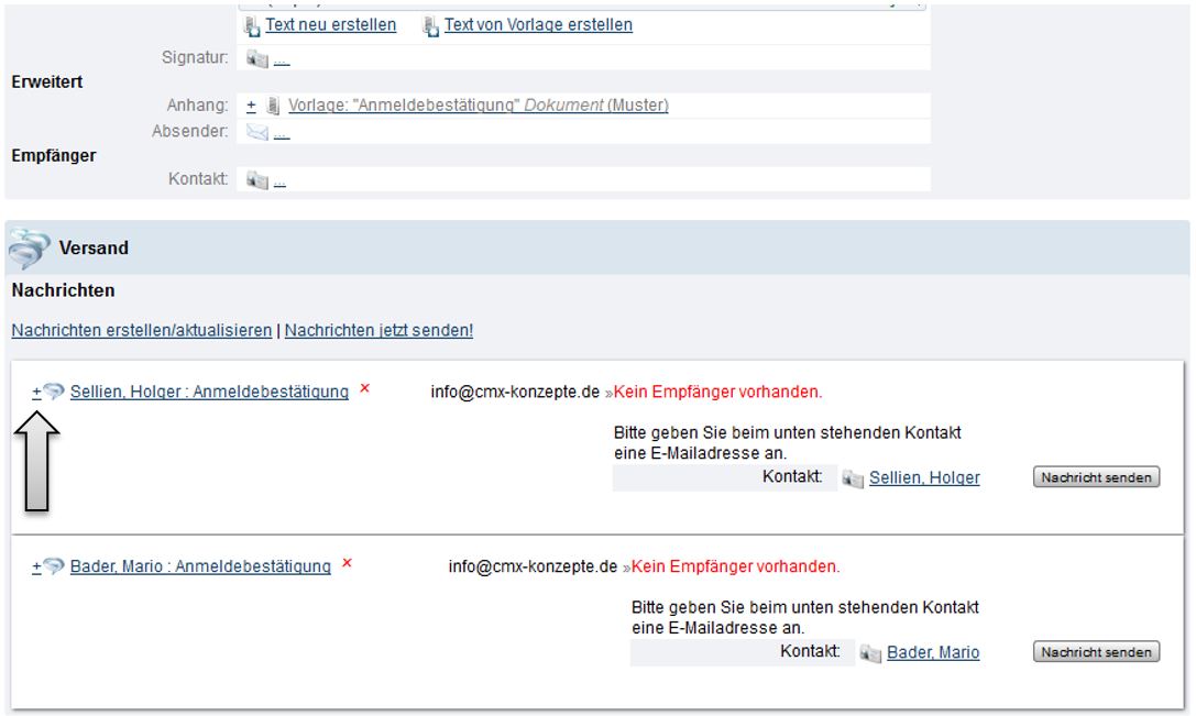 Um einzelne Nachrichten einer Gruppennachricht individuell zu bearbeiten, muss man -nach dem Anklicken des Links „Nachrichten erstellen/aktualisieren“ - das „+“ vor der zubearbeitenden Nachricht anklicken.