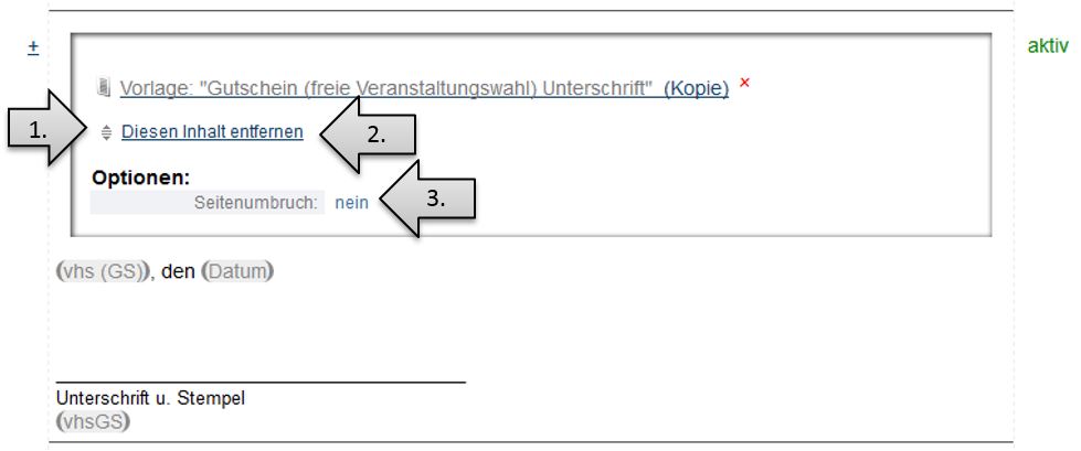 Um einen Textblock zeitweise auszublenden/nicht zu drucken, muss das grüne „aktiv“ angeklickt werden, sodass es zu einem roten „nicht aktiv“ wird.