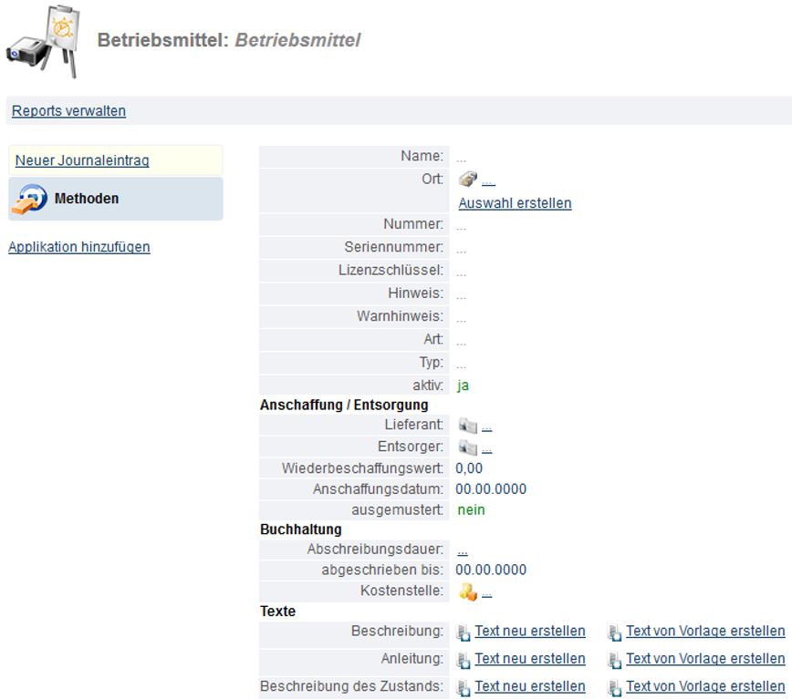 Ein neues Betriebsmittel wird über den Link „Betriebsmittel erstellen“ erfasst (s. obige Abb.).