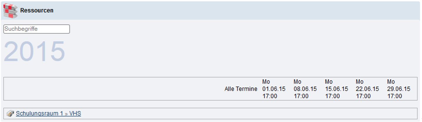 Um die verfügbaren Ressourcen zu sehen, muss der jeweilige Ort angeklickt werden (in obiger Abbildung z.B. „Schulungsraum 1 >> VHS“).