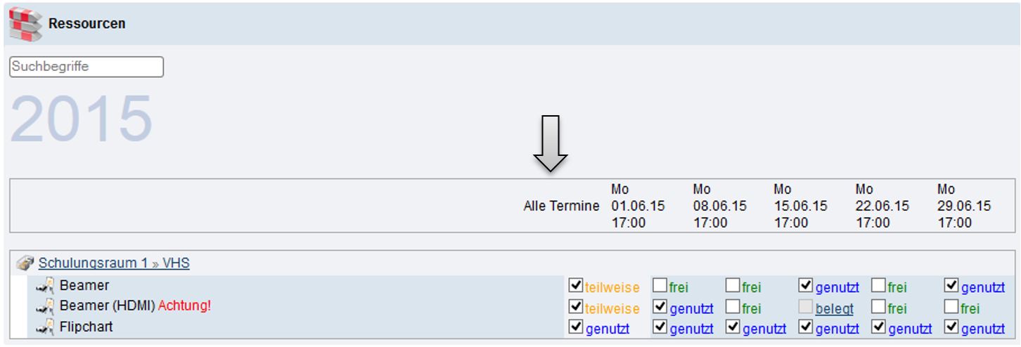 Nun können die Ressourcen entsprechend der Nutzung angehakt werden. Wird eine Ressource für die komplette Veranstaltung benötigt, braucht nur ein Haken in der Spalte „Alle Termine“ gesetzt zu werden.