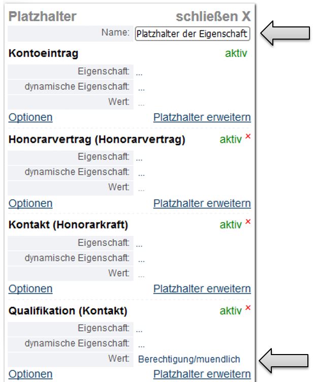Der Übersichtlichkeit halber sollte zuerst dem Platzhalter ein Namen gegeben werden. Dann ist im untersten Objekt bei der Eigenschaft „Wert“ der Name der Datenstruktur und der Name des Wertes durch einen „ / “ getrennt einzugeben. In diesen Beispiel wäre dies „Berechtigung/muendlich“