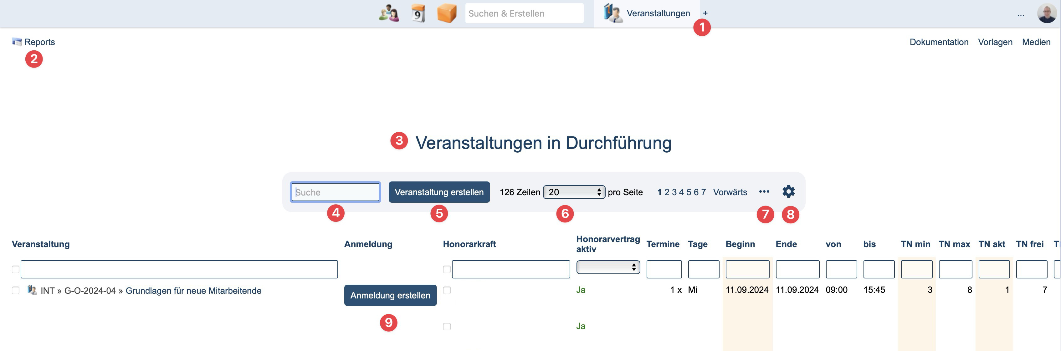 - Wie gewohnt zeigt die Hauptnavigation die ausgewählte Objektart (im Beispiel "Veranstaltungen")