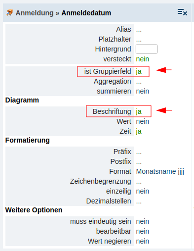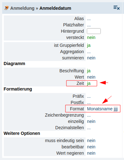 ist Gruppierfeld" definiert wurde (Information zur X-Achse im Diagramm).In der selben Spalte "Anmeldedatum" ist über das Attribute "Zeit" und das Attribut "Format" definiert, woher die Zeit kommt und welches Darstellungsformat diese hat.