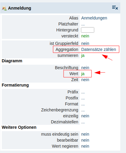 - Hinweis: Entspricht die Spalte, wo dieses Abtritt auf "ja" gesetzt wird keinen richtigen auswertbaren Wert, muss zusätzlich beim Attribut "Aggregation" in der Spalte eine entsprechende Auswahl hinterlegt werden. Am häufigsten wird die Auswahl "Datensätze zählen" oder "Summe" genutzt. Die Aggregation "Datensätze zählen" bezieht sich auf das Objekt (z.B. wie viele Anmeldungen es sind). Die Aggregation "Summe" bezieht sich auf Beträge und bildet die Summe daraus (z.B. der Gesamtbetrag pro Anmeldung einer Veranstaltung summiert).